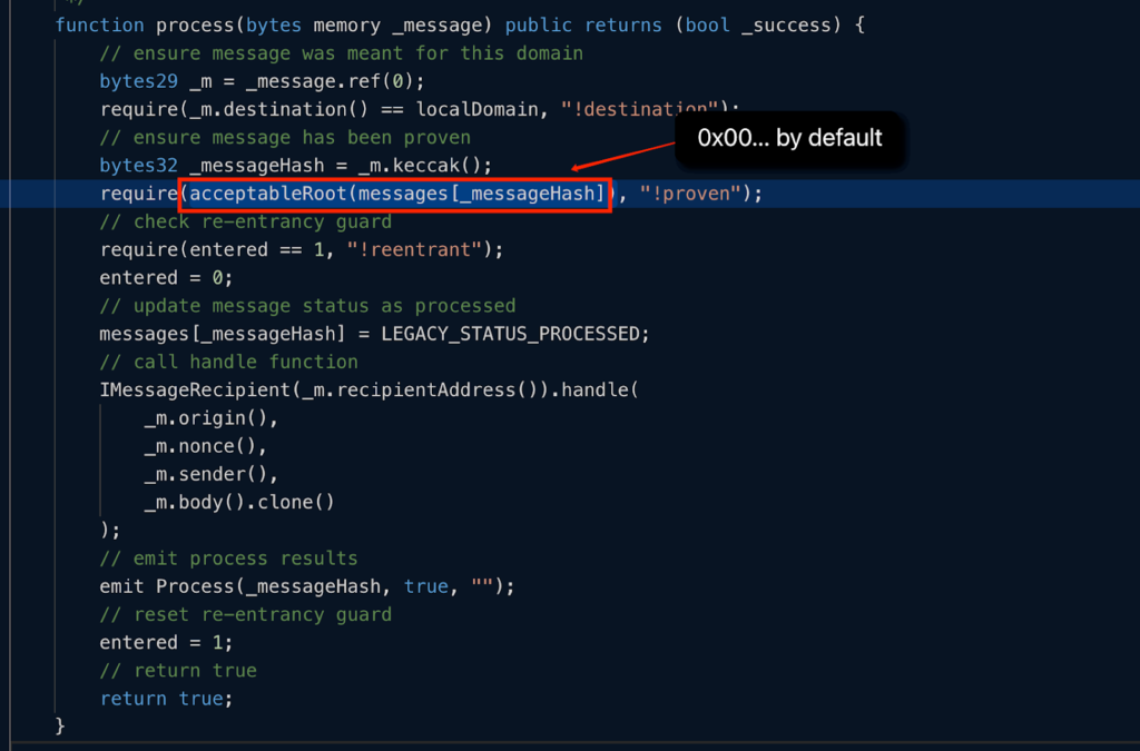 Within the function, there’s an internal check acceptableRoot(messages[_messageHash]). This verification ensures the root has been previously submitted and waits until the optimistic timeout duration concludes. Interestingly, the default value for messages[_messageHash] is 0x00.