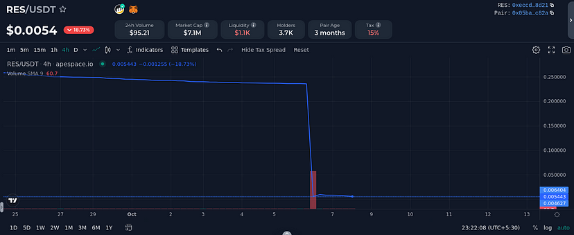 Following the attack, the $RES token’s valuation plummeted sharply, witnessing a 97% decline. From an initial price point of $0.23, it dwindled to a mere $0.0060.